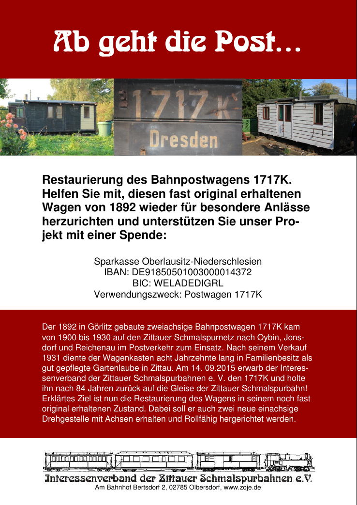 Achtung! Der Interessenverband der Zittauer Schmalspurbahnen e.V. ist nicht der Betreiber/Eigentümer der Schmalspurbahnstrecken in das Zittauer Gebirge. Dies ist die SOEG mbH. Für Fragen und Probleme wenden Sie sich bitte direkt an Kundenbuero@SOEG-Zittau.de.