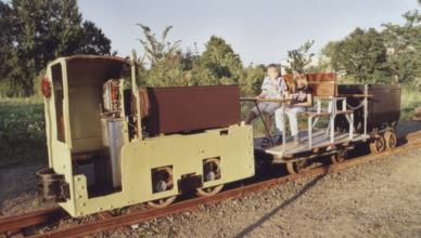 After we had finished the track construction of the gauges 500mm and 600mm (sketch other side) the desire grew, a Akkulok with 600mm gauge and a To acquire personal lore. On the 7.5.2004 the Akkulok B 360, No. 4 was handed over to us by the company Geomin in Hermsdorf. This battery was built around 1990 by the SDAG bismuth to the lime mine in Hermsdorf ready to go and operational, delivered. In Hermsdorf this Akkulok was parked the last 10 years. For the 5th day of the miner 2004 of our working group, this Akkulok was breathed new life. The Akkulok B 360 is a further development of the type Metallist. The construction of the passenger lorry was made possible by the acquisition of a undercarriage 600mm track, by the company Kirschner Bauhandwerk in Zittau. The Construction of the superstructure was carried out in the summer of 2004 by the club members. Our exhibition space is covered by the Akkulok B 360 No.4 and this person lore (self-made) completes. The pedestal can be admitted for 4 adults.